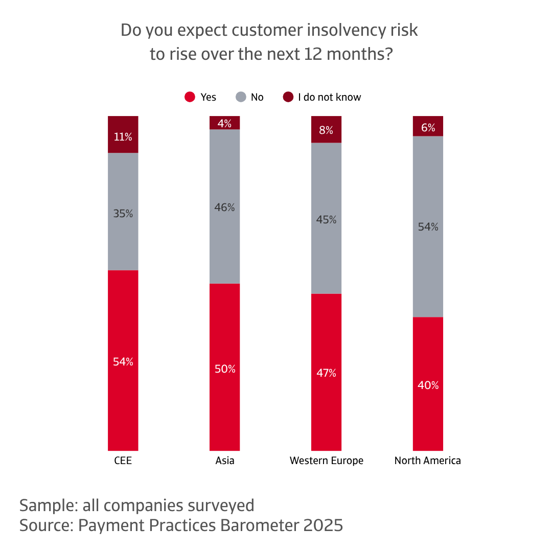 In North America, the sentiment is largely cautious. Most companies do not expect insolvency levels to improve in the near term. The prevailing mood is one of watchfulness, with businesses preparing for stress that may not yet be visible on the surface. In Asia, more companies anticipate a rise in insolvencies than those expecting stability. Many are staying alert to potential external shocks and closely monitoring global developments that could affect their operations.