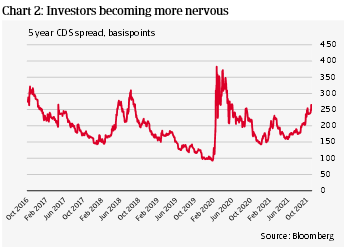 Rising policy rates translate into a higher effective interest rate on government debt, which increased from its low of 5.7% in February 2021 to 6.8% in September. This turning of the interest rate tide against Brazil's highly interest-sensitive government finances has raised concerns that the normalisation of Brazil’s policy rates will destabilise them. Worries about the credibility of the spending ceiling are adding to these concerns, as the government used the 'state of calamity' clause again this year, confronted with a second wave of Covid-19. Additionally, the upcoming general and presidential elections in October 2022 will make fiscal consolidation harder. The concerns are also reflected in the CDS-spread, which rose from below 100 basis points just before the outbreak of the pandemic to more than 200 basis points in October 2021 (see chart 2).