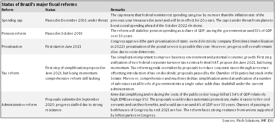 However, passing such reforms is not easy in low growth economies such as Brazil, while vested interest will slow progress. Proposals for the administrative reform, aimed at reducing mandatory spending (which accounts for almost 93% of federal primary spending) are stuck in Congress due to strong resistance from unions. Meanwhile, the reform window is narrowing in the run-up to the October 2022 elections.