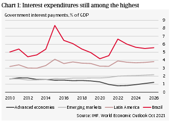 As market sentiment is shifting and inflation expectations are rising, the government is confronted with higher interest rates. Brazil's inflation accelerated to 10.7% in October 2021, far exceeding the upper ceiling of the central bank's 2.25%-5.25% target range. Higher inflation reflects currency depreciation and rising food and energy prices due to the worst drought in almost a century (Brazil is highly dependent on hydropower) and ongoing supply chain disruptions. In response, the Brazilian central bank lifted the Selic rate several times since March 2021, to 7.75% in October. This made it the first in the region to start its rate hiking cycle and also by far the most aggressive. Additional increases can be expected in the coming months, which could lift the Selic rate above 10% in the course of 2022, higher than currently foreseen by the central bank and the IMF and implying a restrictive stance.