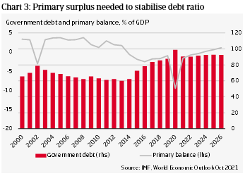 The third option - reforms and fiscal consolidation - seems the only credible way forward. We expect the primary deficit to decrease significantly to an estimated 1.2% of GDP in 2021, as Covid-19 related measures will be reduced, revenues will rise as the economy recovers, and the current high inflation pushes the denominator up. The IMF concluded in September 2021 that Brazil would need to move to a primary surplus of 1.1% of GDP in 2026 in order to stabilise the debt ratio around this year's level (see chart 3). Compliance with the expenditure ceiling from 2022 onwards would be a necessary condition to make this feasible. However, it might not be sufficient, as the stronger than expected interest rate hikes could result in higher than current forecast interest expenditures and fiscal deficits. Moreover, in order to put the debt ratio on a downward trajectory, Brazil would need fiscal reforms, such as improving the highly complex tax system and reducing mandatory public spending, in particular the high wage bill, which is at almost 14% of GDP significantly above the 9% emerging markets average.