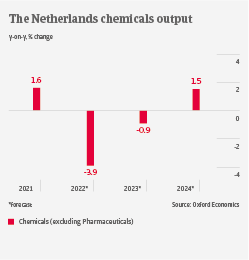 Dutch chemicals output should decrease by about 4% in 2022 as the industry suffers from high energy prices and supply bottlenecks of raw materials. In 2023, we expect output contraction to lower to about 1% because supply issues of commodities will ease.