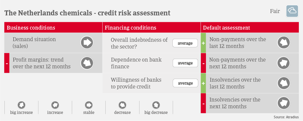 We currently assess the credit risk situation of the Dutch chemicals industry as “Fair”, given the strong financial position of many businesses, in particular multinational players. However, challenges are mounting. Should high gas prices in the Netherlands persist over a longer period, new investments in chemicals production sites could drift to markets where energy is less expensive. Additionally, higher investments in order to meet environmental standards will be a challenge, due to both tighter regulations and growing demand from consumers for ‘greener’ products.