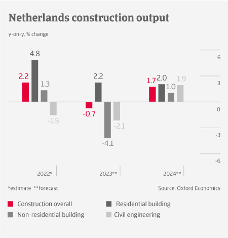 In 2023, Dutch construction output is expected to contract by 0.7%, due to a slowdown in residential construction growth, as well as contractions in the non-residential and civil engineering subsectors. At least the renovation work segment focused on energy-efficient appliances (e.g. solar panels, heating pumps) is still growing.