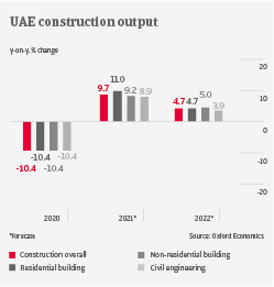 After a 10.4% contraction in 2020, UAE construction output is forecast to rebound more than 9% in 2021. However, the recovery of the property market, which is still struggling with overcapacity, remains rather uncertain. The industry was already performing poorly before the coronavirus outbreak, as modest economic growth over the past couple of years prevented higher spending on building projects. This led to increased cash difficulties and tight margins for construction businesses, especially for smaller companies.