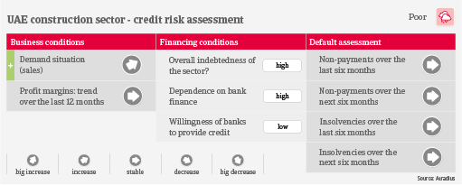 Payments in the construction industry take about 180 days on average. Due to strong competition, low margins and a lack of bank financing, the number of protracted payments has been high over the past two years, and the number of non-payment notifications is expected to remain elevated in the coming months. In March 2021 Dubai's biggest contractor Arabtec filed for bankruptcy. While insolvency proceedings are rather uncommon in the UAE, there have been some sizeable runaway cases in the construction industry, leaving behind unpaid creditors and bank loans. More such cases cannot be excluded in the short- and mid-term.