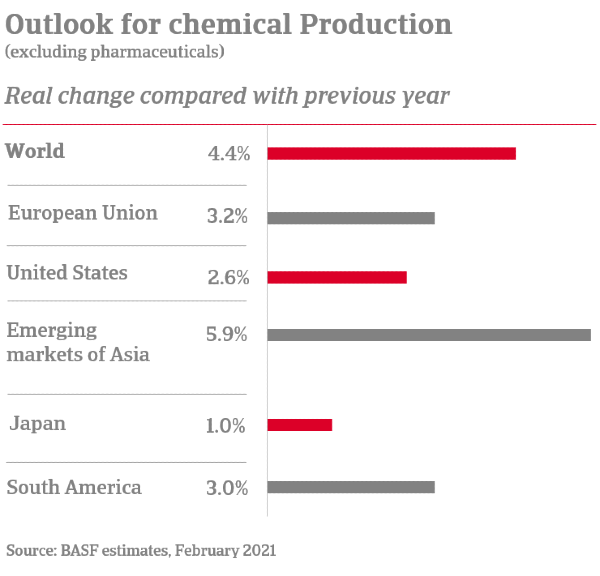 The global outlook for chemical production is positive, with growth projected by most analysts, especially for China and emerging economies. According to BASF, global chemical production (excluding pharmaceuticals) is expected to grow by 4.4% in 2021. This is above average for the years prior to the coronavirus pandemic and represents a strong rebound following the pandemic recession where overall global chemical production contracted by 0.4% in 2020, (compared to an increase of 1.9% in 2019).