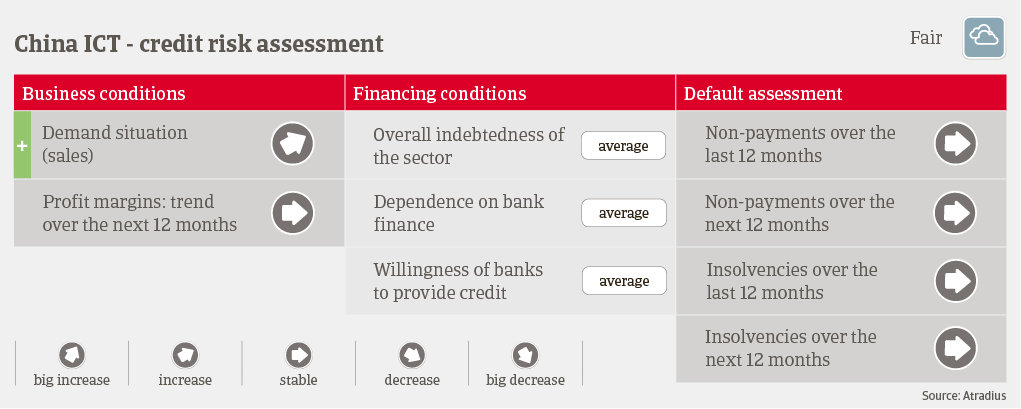 We expect that profit margins of Chinese ICT businesses will remain stable in the coming twelve months, because in most cases both producers and retailers are able to pass on increased input prices for chips to end-customers. Additionally, many companies have reduced other expenses. Payment terms in the Chinese ICT industry take 60 days on average, and the amount of non-payment cases is low. When payment delays occur, the reasons are mainly administrative issues or disputes about product quality. We expect no substantial increase in payment delays and insolvencies in the coming twelve months.