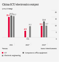 After a 15% increase in 2021, we expect Chinese ICT output growth to slow down in 2022 and 2023, but to remain solid. Production of electronic components and boards are the main growth driver, and chip manufacturers have started to ramp up production to overcome supply shortages. Nevertheless, we expect that chip supply bottlenecks will persist into 2023. This affects ICT production and sales, particularly in the PC, laptop, smartphones, and consumer electronics segments. Another issue has been the lockdowns in several regions and large cities like Shenzhen and Shanghai. These have been partially lifted, but another wave of the pandemic with subsequent new restrictions remains a downside risk for local sales as well as domestic and international supply chains.