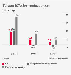 Taiwan has widely benefited from sharply increased demand for chips and other ICT products since 2020. Electronic engineering (which includes chip manufacturing) increased 17.4% in 2021, and we expect another 7% growth this year. Output of computers and related equipment will level off due to a certain market saturation after high growth rates seen in 2020 and 2021. However, ongoing business digitalisation will drive demand for related items. For the consumer electronics segment, we expect a stable performance with ongoing demand for digital entertainment and gaming devices.