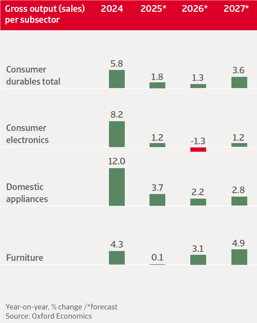 - After increasing by 5.8% in 2024, global sales growth of consumer durables is forecast to slow down to 1.8% in 2025 and 1.3% in 2026