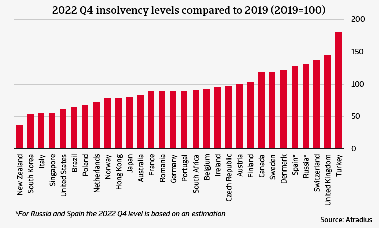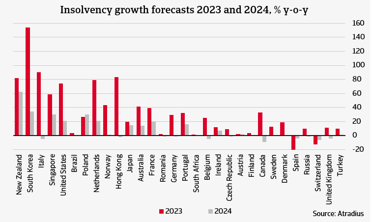 - In 2023, we expect sharply rising business failures in South Korea (154%), Italy (90%), Hong Kong (83%), New Zealand (82%), the Netherlands (79%) and the United States (74%).