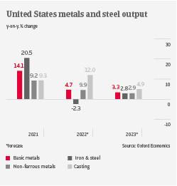 Persistent high inflation remains a downside risk, as it could trigger more aggressive monetary tightening by the Federal Reserve. A hard economic landing would result in decreasing consumption and investment, dampening metals and steel demand. In such a scenario, we would expect metals and steel output to contract by about 1% in 2023.