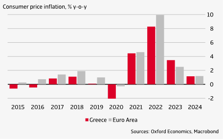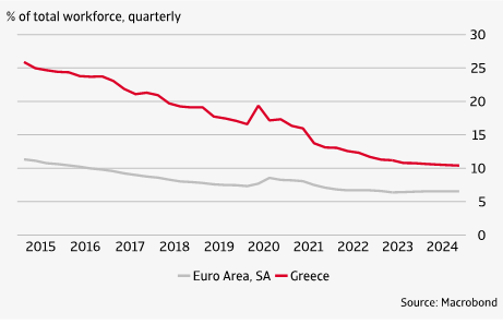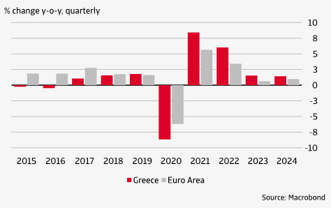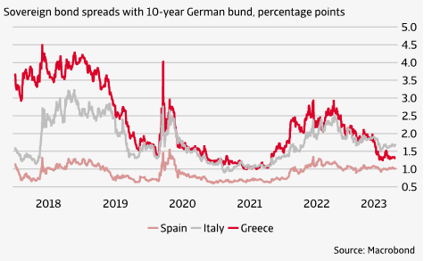 Economic growth is now set to continue, though at a considerably slower pace. Economic sentiment indicators rose again in July, increasingly diverging from the eurozone where they have been falling recently. Services, especially tourism, are an important driver; industrial production is weak. Consumer confidence is rising rapidly, with no material impact from the recent fires on e.g., tourism. Q2 expansion was moderate. We expect GDP growth at 1.5% this year and 1.4% in 2024, both above eurozone average (figure 1).