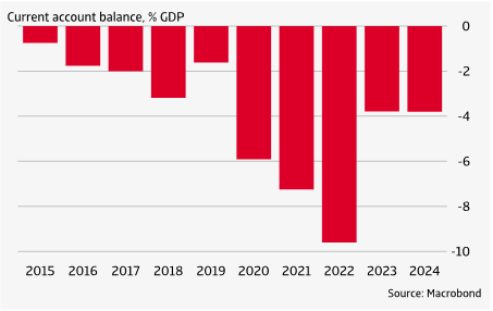 Second, the labour market dynamics are robust. June data show unemployment further decline to 11.1%, with employment up 1.1% y-o-y. This development is expected to continue, with figures remaining (far) above eurozone average in 2023 (figure 3). Real wages have taken a hit though, declining 4.7% in 2022 due to nominal wages insufficiently compensating inflation. Third, as the current account balance has deteriorated sharply over the past couple of years, recovery is now on its way back. This is due to now lower energy cost and the recovery of tourism. In Q1 the deficit dropped to 3.5% of GDP, at which level it is expected to stabilise (figure 4). Fourth, with the ECB having hiked interest rates considerably, a process that is now expected to wane, borrowing costs have gone up notably. This puts significant pressure on bank lending (see below).