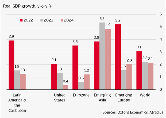 Meanwhile, the region's outlook has worsened. We forecast GDP growth to slow to 1.5% in 2023 and to remain sluggish at 1.3% in 2024, lagging other emerging market regions. This slowdown mirrors the deterioration in the external environment, especially in key trade partners, the US and China. Skyrocketing inflation in the US and the Federal Reserve’s monetary tightening response both pose headwinds to global economic activity. Although China's economy is recovering after the late lifting of that country’s zero-Covid policy, its industrial production remains meagre and as such the demand for commodities. Lower demand for goods as well as travel from advanced economies and less production in China will keep Latin America’s economic growth below its pre-pandemic annual average of 2.5% over the coming years.