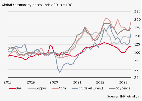 A three-year – unusually long - La Niña (2020-early 2023) resulted in a severe drought in Northern Mexico and southern South America, home to some of the world’s largest producers of soy, corn and beef. Of these producers, Argentina was hit the most and to a lesser extent also Brazil (in 2020/21), Paraguay and Uruguay.