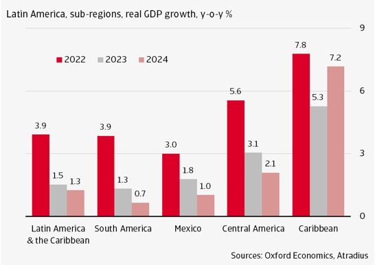 - The region's largest economies are facing particularly weak growth prospects. As these are mainly located in South America, this sub-region will show the poorest performance. The economies of Argentina, Chile and Colombia will contract in 2023 or 2024. Central America is expected to see steady growth. This is also the case for Dominican Republic, making it the exception among the region's larger economies. The smaller economies in the Caribbean will show the fastest growth, but most of their economies, particularly the tourism dependent countries, are still below their pre-pandemic levels.