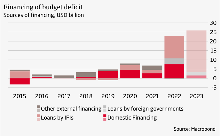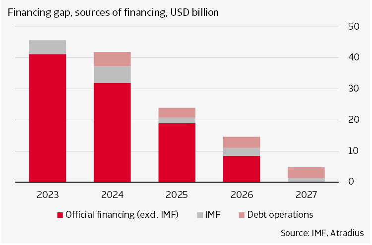 Under the downside scenario, the financing gap could grow to USD 140 billion. The external support requirements under this scenario remain high until 2026. Under the downward scenario, the IMF assumes additional financing will be arranged, which is consistent with assurance given by the international group of creditors. Again, most of the funding has to come from international donors. A return to the international capital market is not deemed realistic during the duration of the IMF programme, but the IMF does assume a return to the capital market is possible in 2029.